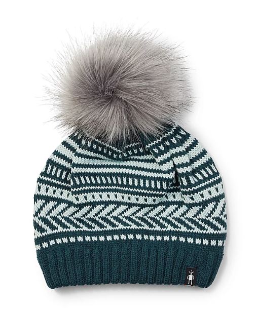 - The beanie is topped with a faux fur pom that adds a touch of elegance and style.