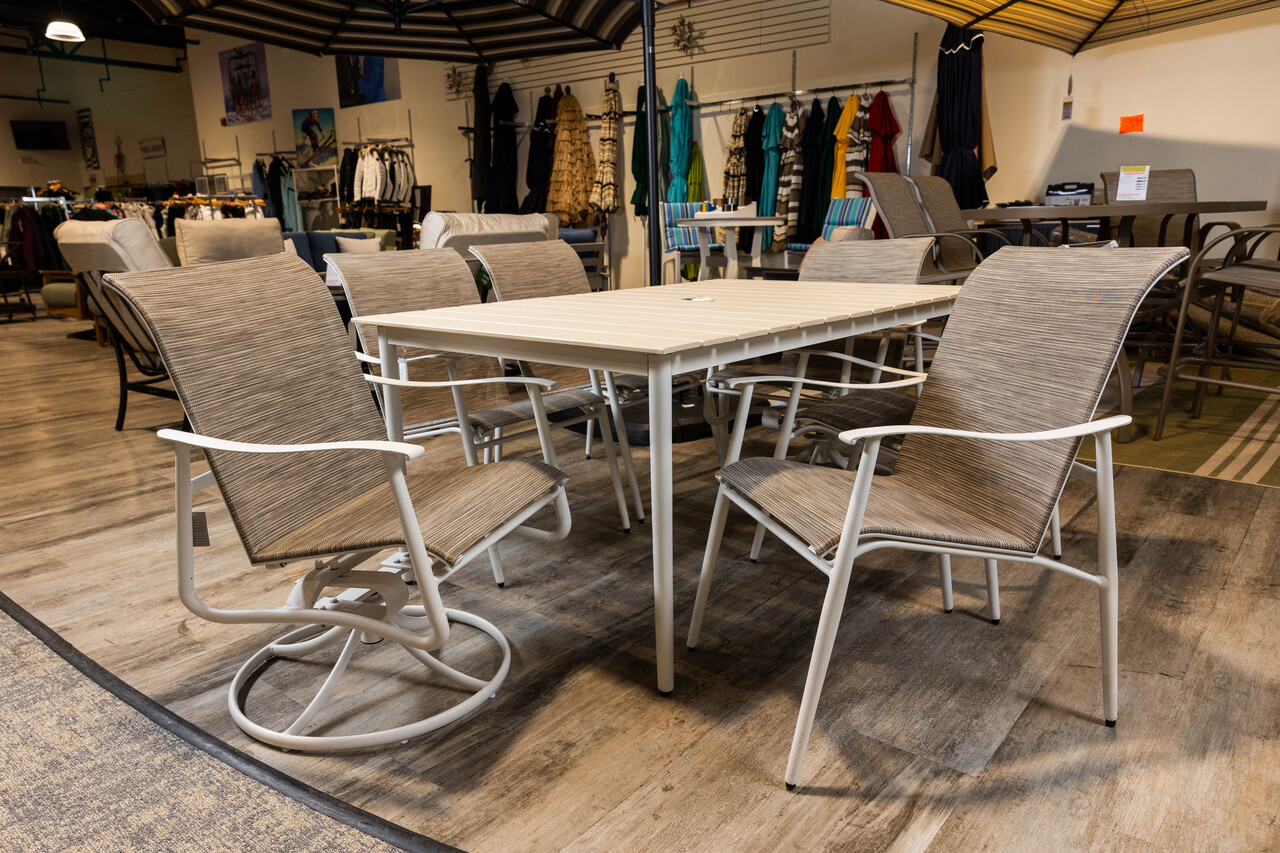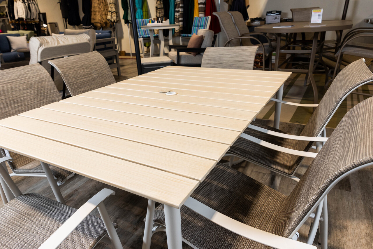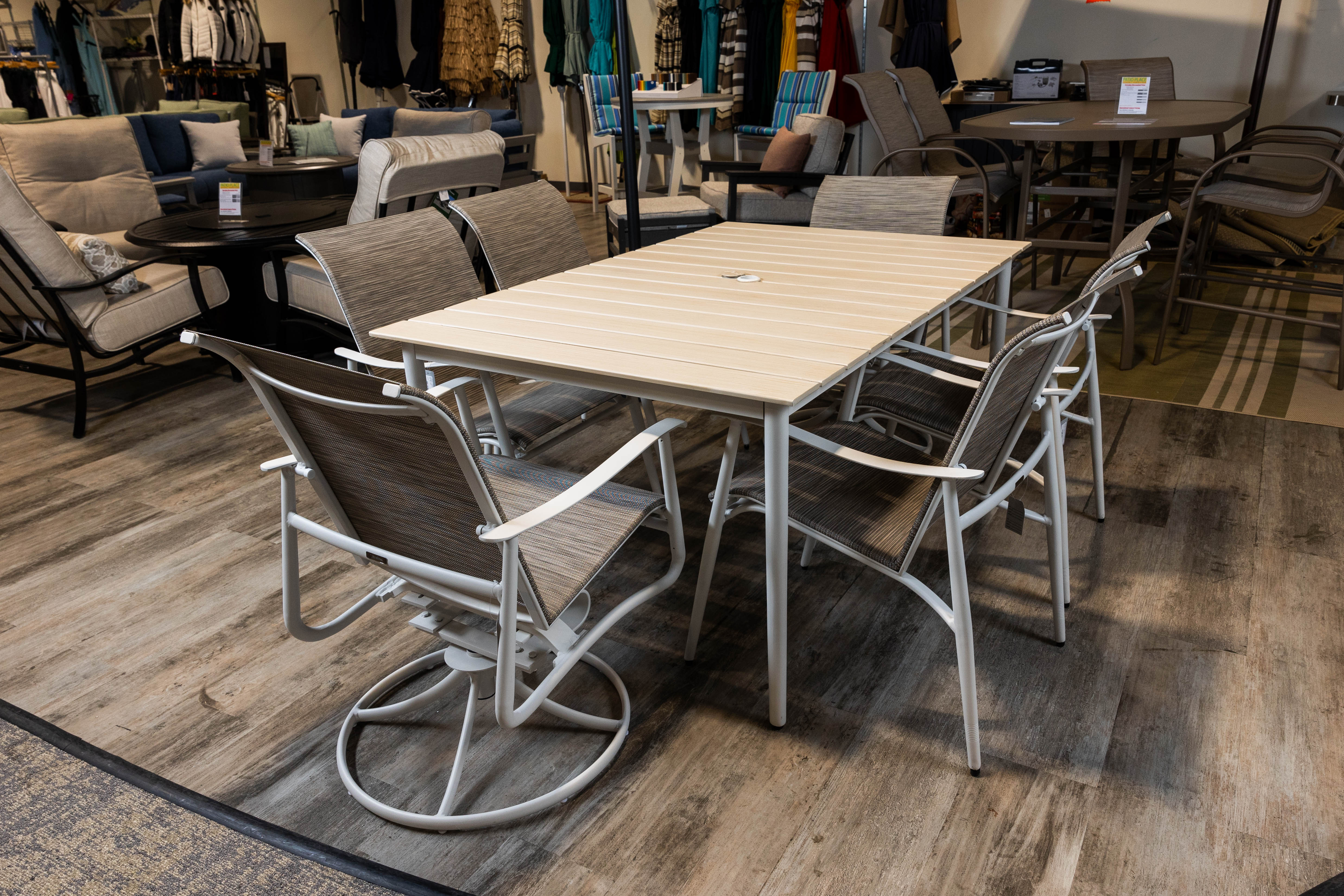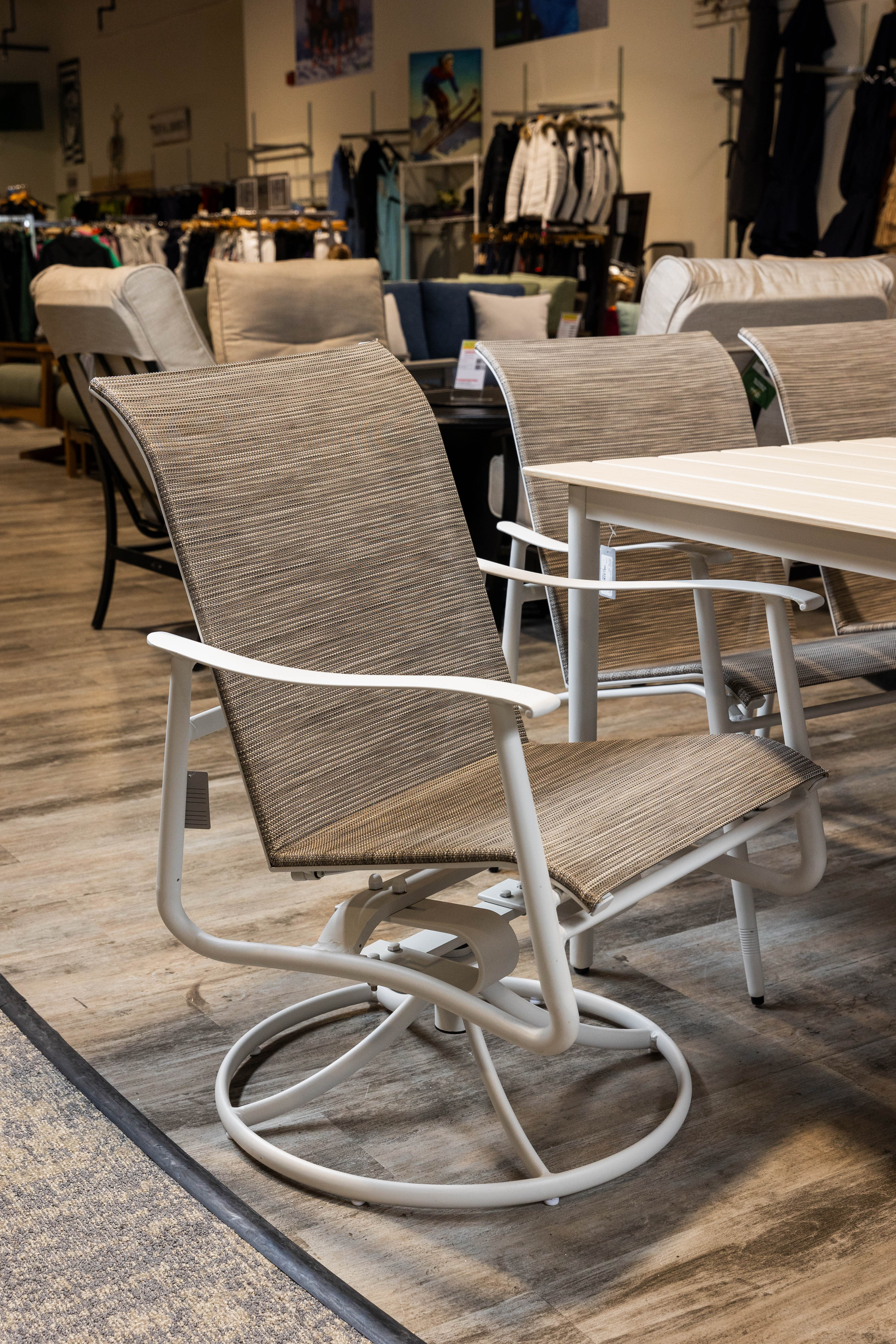Set includes a 42x64" Strata Dining Table w/4 Sling Dining Chairs and 2 Swivel Rocking Chairs - Gen Teak/Linen Frame with Watercolor Tweed Pearly Sling