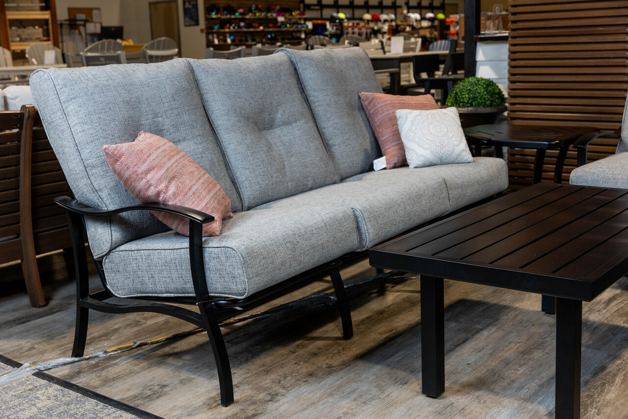 The Albany Sofa from Mallin Casual Furniture is expertly crafted with an aluminum frame, offering durability and a lightweight structure ideal for patio settings. The sofa features cushion seating, available in a variety of fabrics and finishes, allowing customization to suit your aesthetic preferences. Constructed of extruded aluminum, the Albany Sofa combines classic and modern styles, providing a harmonious blend of elegance and comfort.