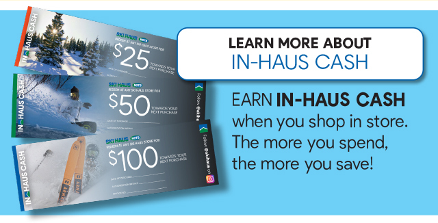 Every time you shop at Ski Haus, you earn In-Haus Cash—store credit you can use toward future purchases. It’s our way of saying thanks for being part of the Ski Haus family. IN-HAUS CASH