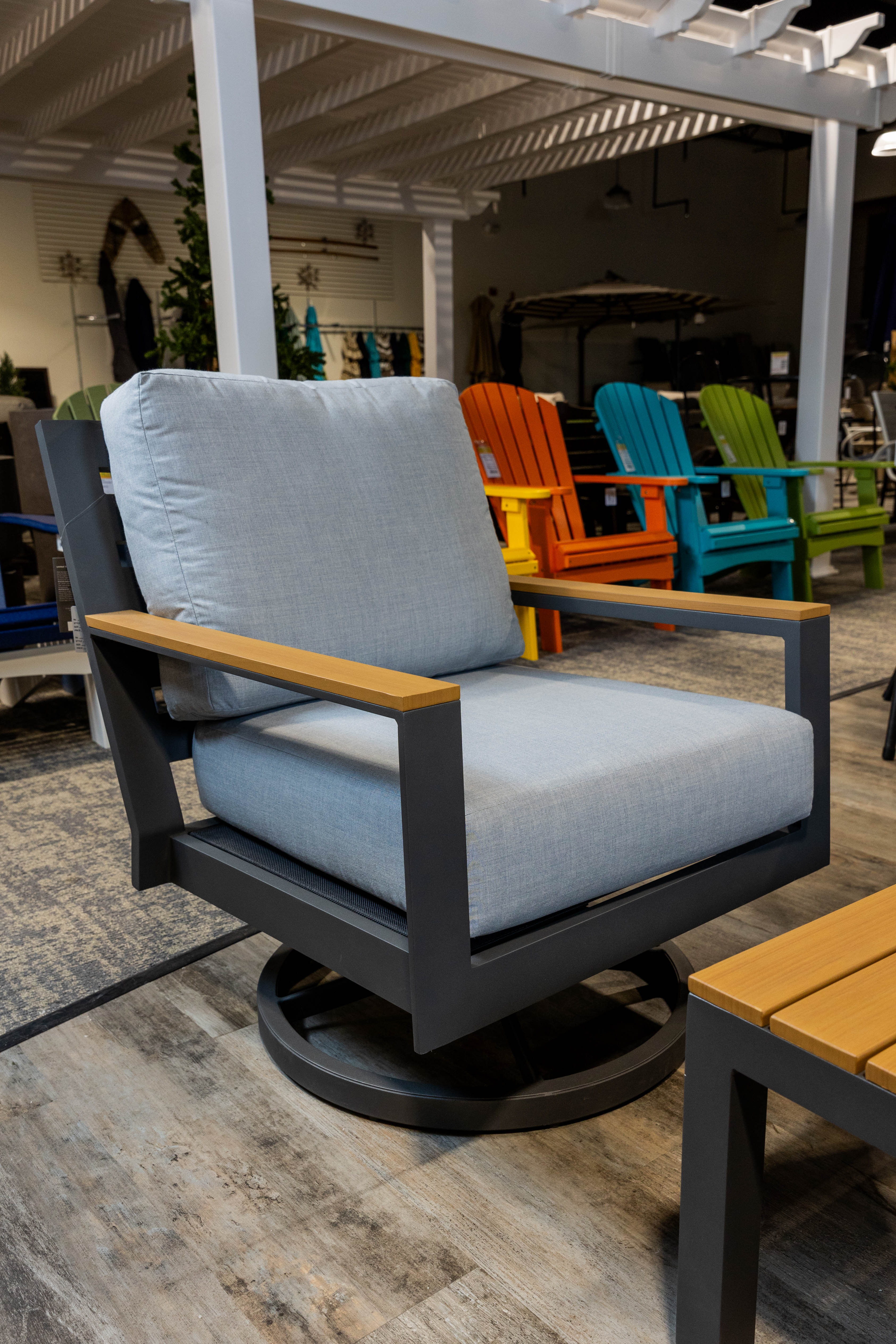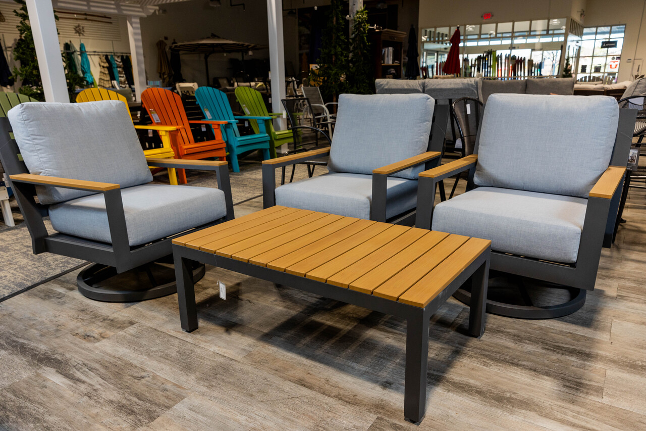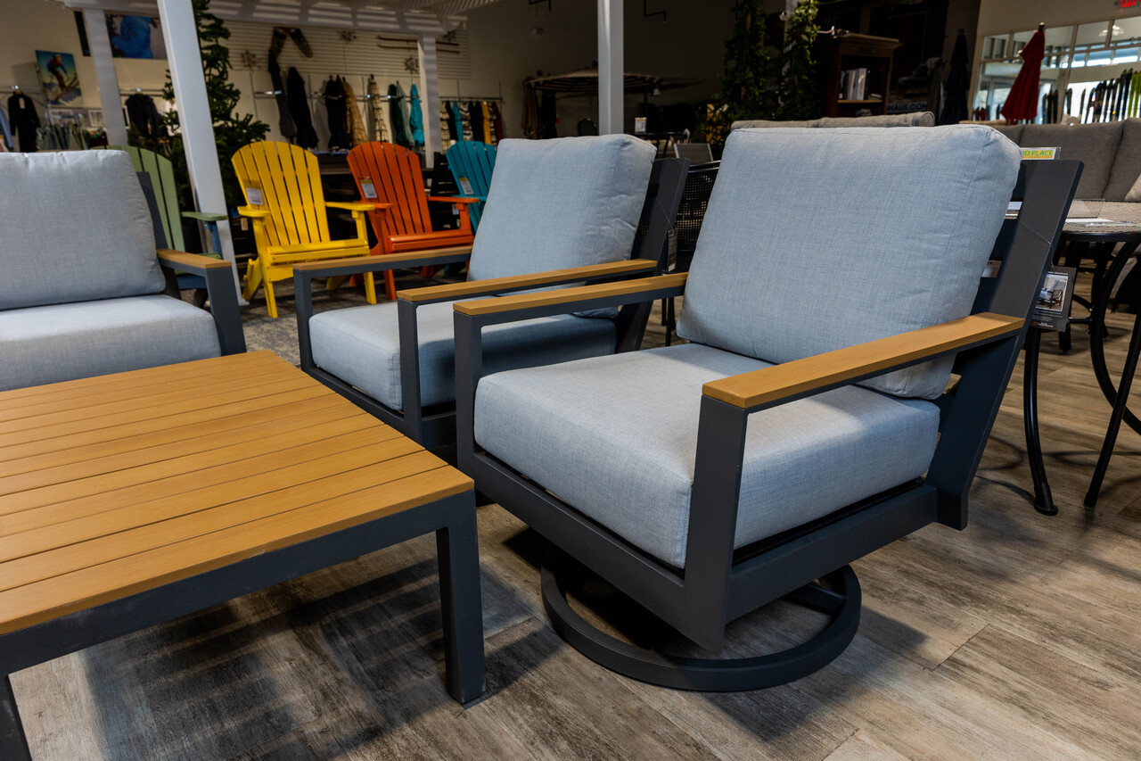 Introducing the Coronado Deep Seating Swivel/Rocker by Patio Renaissance, stocked in Graphite/Freak Teak with Sunbelievable Lifeguard Opal cushions.